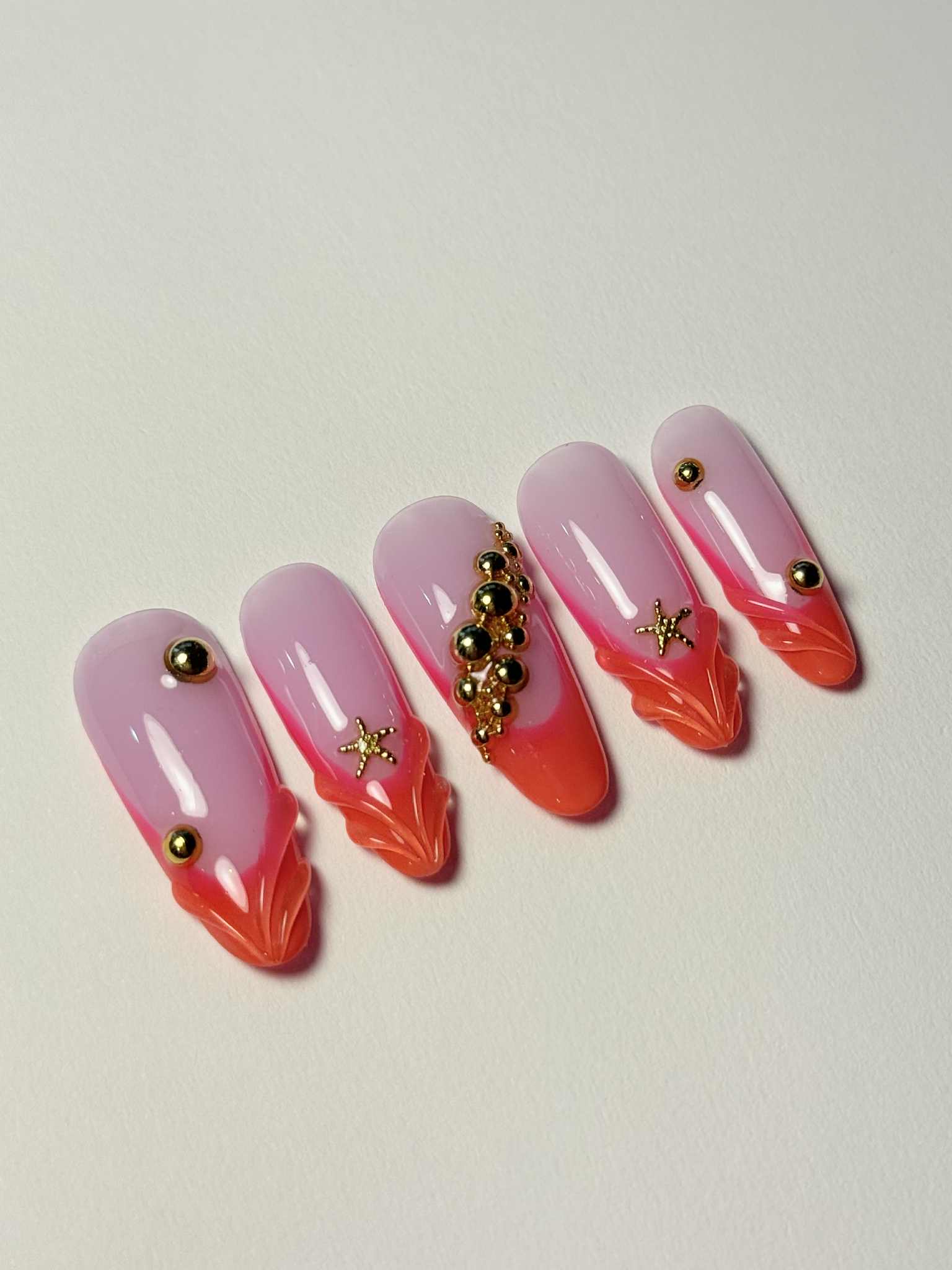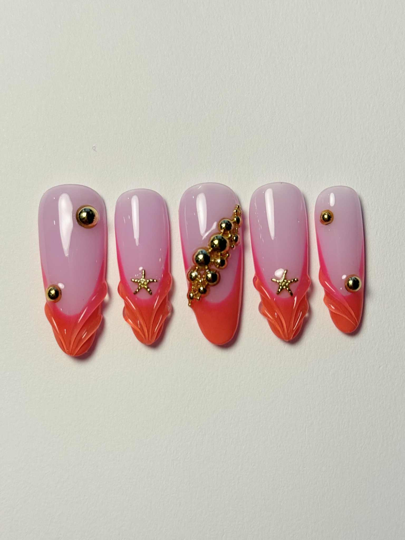 Pink to coral ombré with 3D sculpted details and golden sea-inspired charms. A fresh and vibrant summer design with a beachy twist.