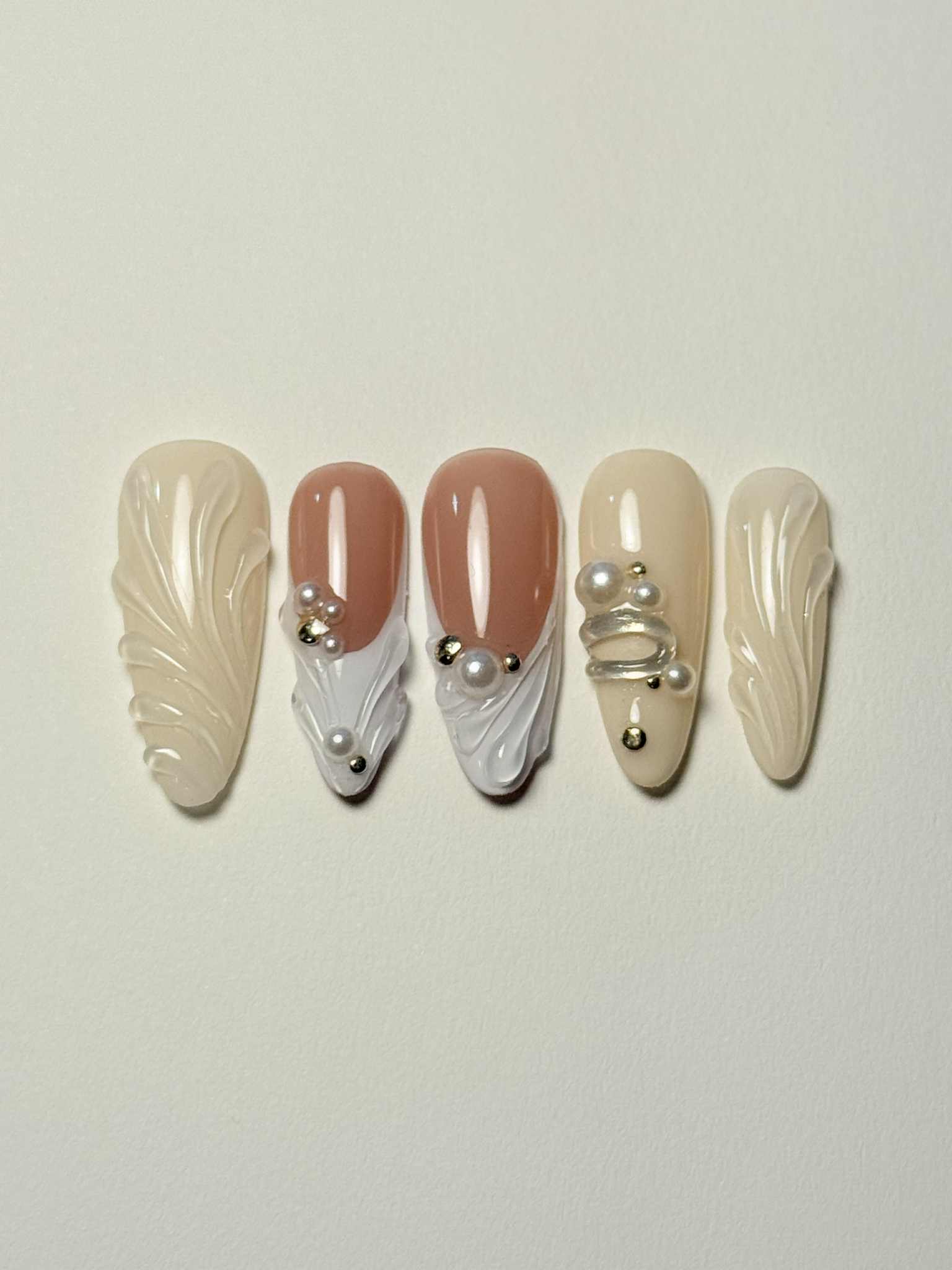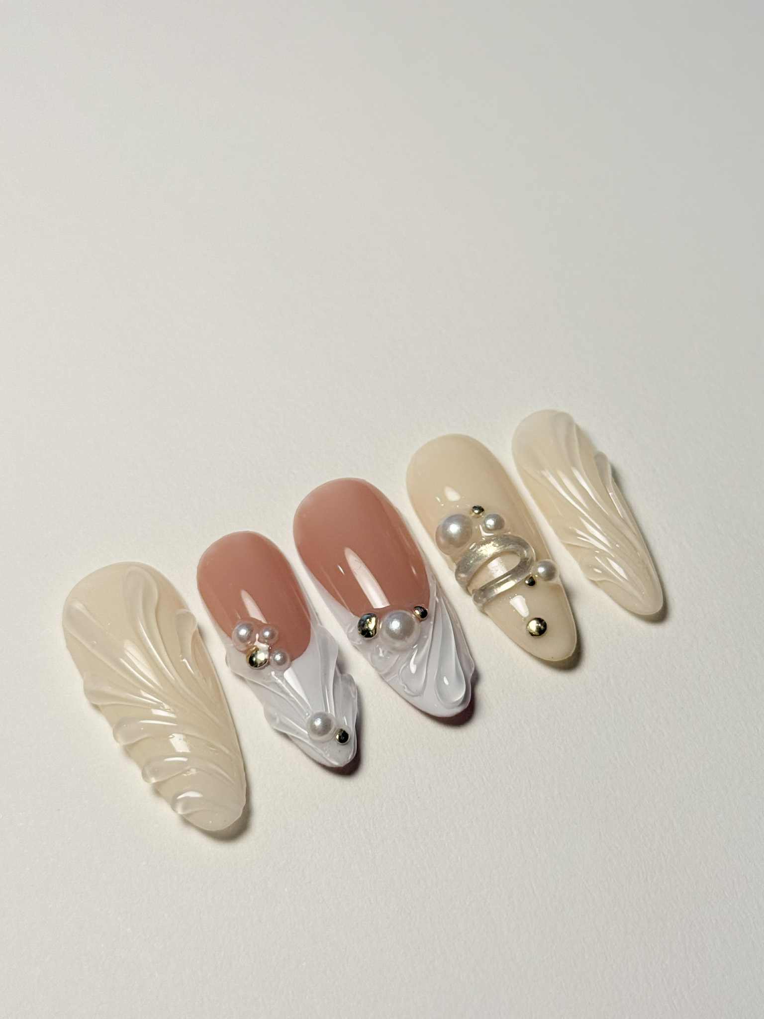 Ivory and nude tones accented with sculpted white swirls and pearl details. Minimal yet luxurious — perfect for any occasion.