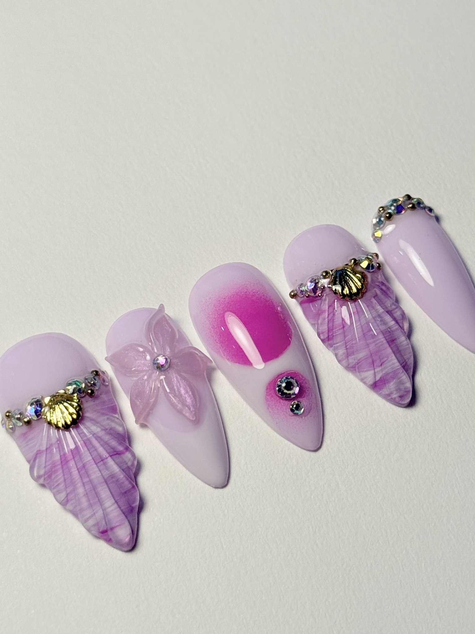 Soft lavender tones meet shimmering seashell accents and crystal gems. A whimsical ocean-inspired set perfect for summer days or dreamy nights.